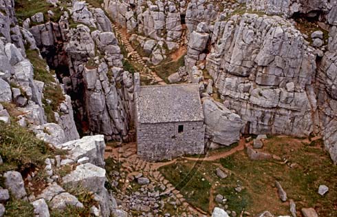 St Govens Chapel tiny 13th century church crammed into a crack in the limestone cliffs 3 miles south of Pembroke. St Goven was a 6th century monk