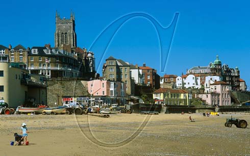 Cromer Seaside with the mostly Victorian architecture above the mostly sandy beach Ancient tractors are used to haul the crab boats up and down the beach