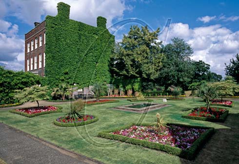 Ornate flowerbeds featuring Yuccas clipped borders and annual bedding plants on the East side of the Hollytrees Museum at the top of East Hill in Colchester Essex The Museum is free and of particular interest to children