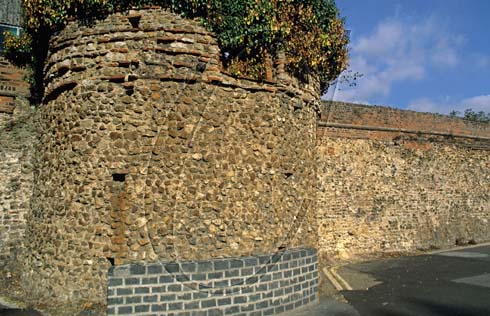 restored Roman Wall with turret on the edge of a public car park in central Colchester