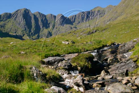 The burn in Coire Dhorchaill, Ladhar Bheinn, the highest Munro on the Knoydart peninsula, Lochaber, Scottish Highlands, Scotland