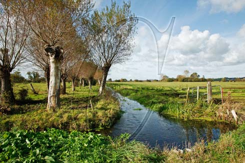 Somerset Levels, near Wedmore, Somerset, pollarded willow trees seen growing on the edge of a drainage ditch, locally known as a rhyne or dyke, they separate the farmer’s fields and helps to control the drainage of water from the surrounding fields.