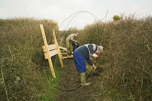 ISLE OF ANGLESEY NORTH WALES UK March Two men working together to put down duck boards along a boggy part of a public right of way - one is levelling out the ground to ensure the walkway is safe