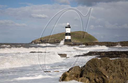 Penmon Point Isle of Anglesey North Wales UK March The waves are crashing onto the beach and the column of the lighthouse on a windy day