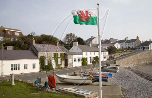 Moelfre Isle of Anglesey North Wales UK April The seafront cottages of this small fishing village with beached fishing boats