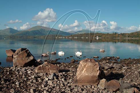 Looking west across Loch Lomond from Millarrochy Bay Visitor / Ranger Centre (East Side of Loch). Swans