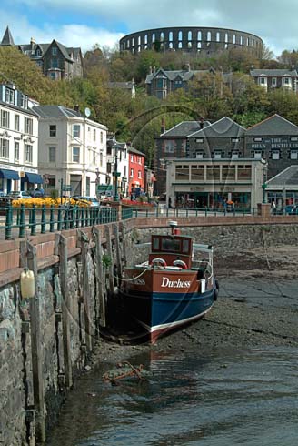 Oban Seafront, Harbour, Boats, Looking to McCaig’s Tower, Oban, Highland Region, Scotland. May 2004.