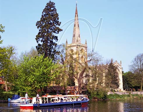 Narrow boat passing Holy Trinity Church, Stratford-upon-Avon, Warwickshire
