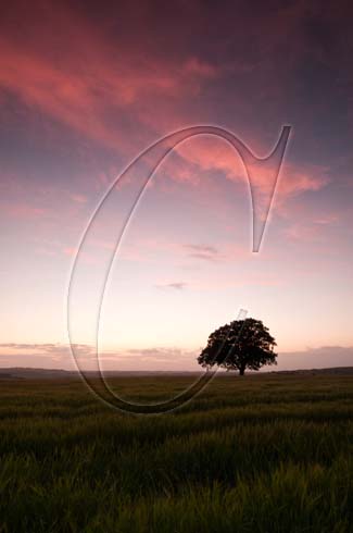 Lone tree amongst growing Wheat at sunset seen from Ridgeway Path on the Wiltshire Downs near Marlborough, Wiltshire