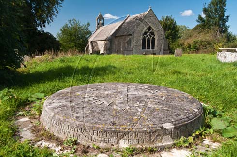 The unusually shaped gravestone of author John Buchan with St Thomas of Canterbury church in the background, Elsfield, Oxfordshire. Buchan is probably best known as the author of ‘The 39 Steps’.