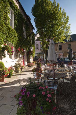 A pavement cafe and colourful floral displays beside High Street in Woodstock near Blenheim Palace, Oxfordshire