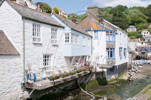 Holiday makers on a balcony overlooking the River Pol at Polperro, Cornwall, England.