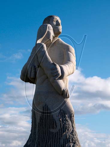 Kilmore Quay, Co Wexford, Eire / October MEMORIAL GARDEN STATUE Sculpture of two grieving people looking out to sea and supporting each other.