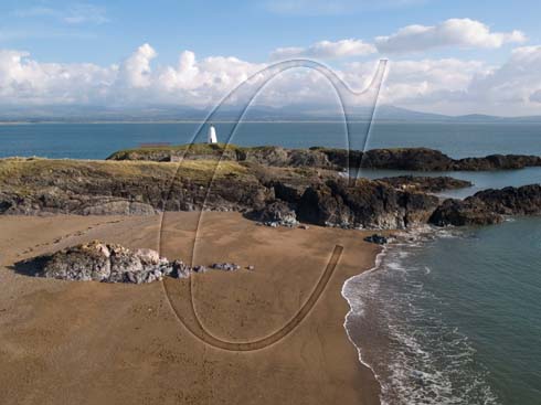 Newborough, Anglesey, Wales, UK / October, ‘TWR BACH’ TOWER on LLANDDWYN ISLAND seen from the lighthouse ‘Twr Mawr’ with a view across the Menai Straights to Snowdonia.