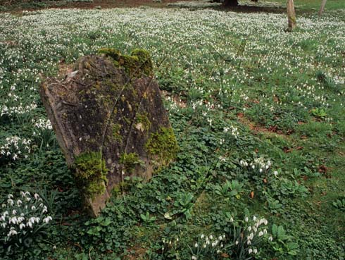 Hurstbourne Priors, Hampshire, England, UK / February OLD GRAVESTONE and WILD SNOWDROPS (Galanthus nivalis) in the graveyard of St Andrew’s Parish church in the upper Test Valley.