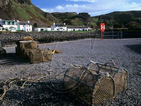 Seil Island, Argyll & Bute, Scotland, UK / October ELLENABEICH CONSERVATION VILLAGE with lobster pots on the quay where the small passenger ferry departs for Easdale