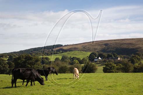 Chorley Lancashire England UK Rural landscape cattle grazing in field by farm view to Wheelton and Anglezarke Moors in West Pennine Moors