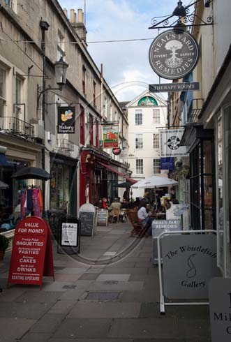 Shops, pubs and open air cafes in a city centre alley in Bath, Somerset