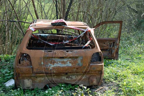 A burnt out car abandoned in woodland in East Sussex