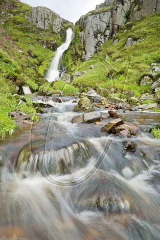 Waterfall from the waters of College Burn in Henhole Gorge in the Cheviots, Northumberland, England