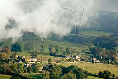 Farms in the Tyne Valley under low cloud on an autumn morning, Northumberland, England