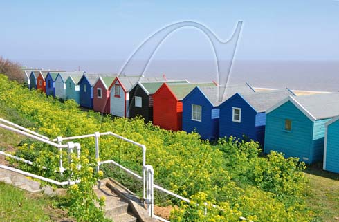 The gaily coloured beach huts at Southwold, Suffolk, England, showing the rear view.
