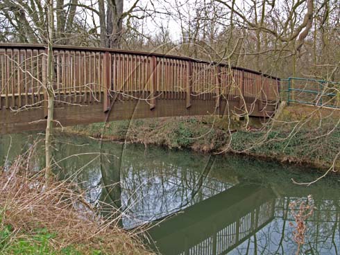Modern wooden bridge crossing Alconbury Brook in the park.