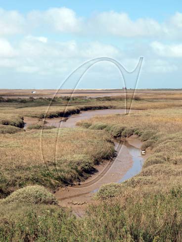 Low tide on the salt marshes at Blakeney has exposed a maze of channels and mudflats.