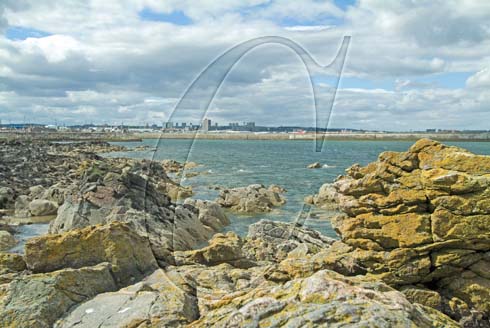 A view across the entrance to Aberdeen Harbour from the south shore of the River Dee estuary and the rocky shoreline by the south breakwater beneath the Torry Point Battery and down from Greyhope Road