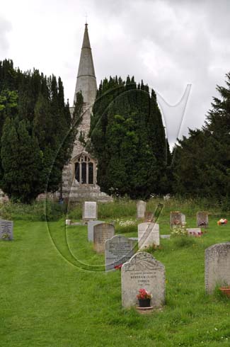 Graveyard of All Saints church in the village of Martin, Hampshire, with the church in the background.