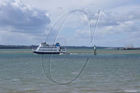 Pleasure boat Ocean Scene leaves the mouth of the River Hamble at Warsash, Hampshire, and heads into Southampton Water.