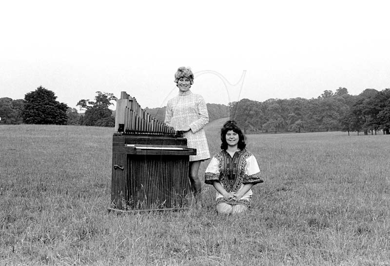 Shirley and Dolly Collins, with Dolly’s portative organ, in a field, somewhere in England, early 1970s